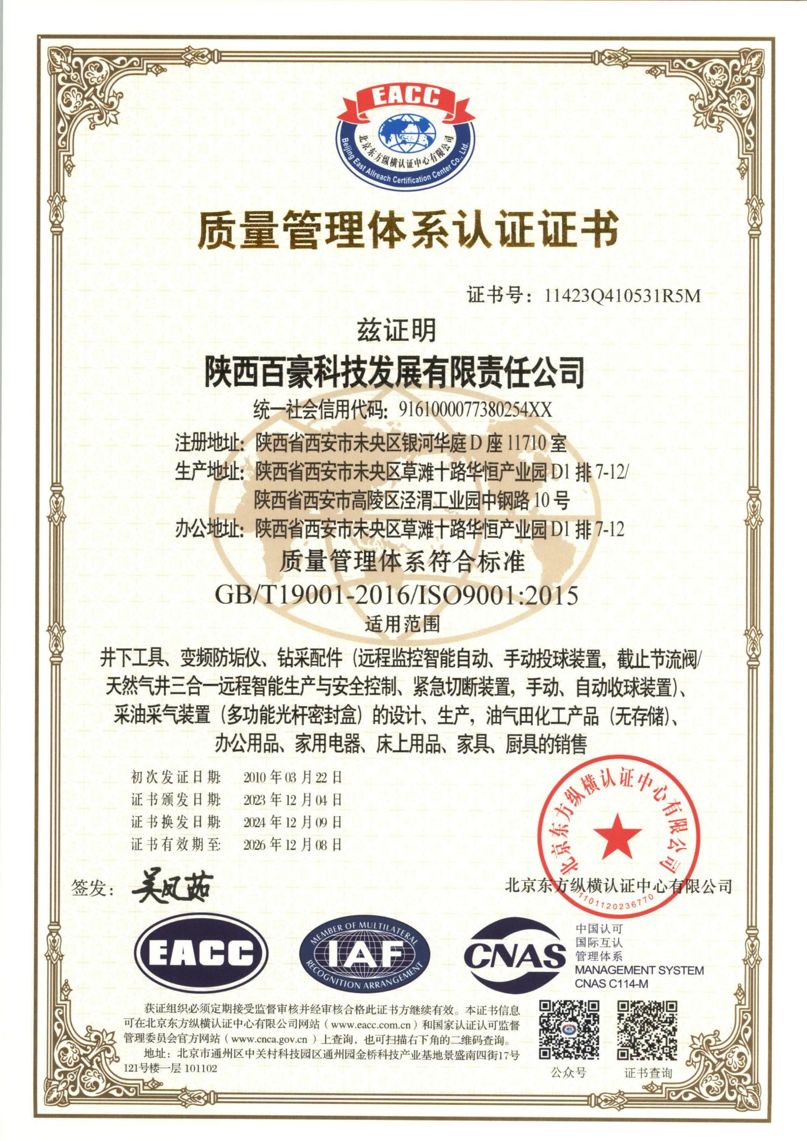 陕西百豪科技发展有限责任公司始建于2005年4月,公司注册地址为西安市未央路银河华庭D座1710室,注册资金1000万元。是一家专业从事油田钻采设备、工具、配件等特种设备制造以及油田工程技术服务,同时为油气田提供家具、生活电器及厨具等配有关服务的集设计、科研、开发、生产、销售于一体的综合性企业,公司产品广泛销往长庆、延长、青海、胜利、中原等油田,创造了良好的经济效益和社会效益。