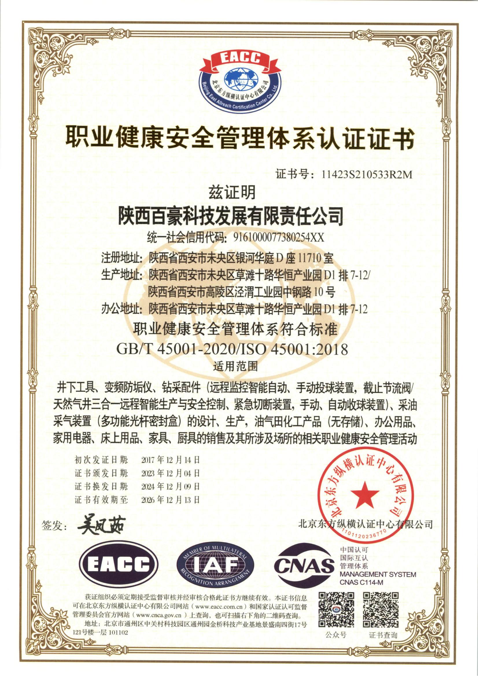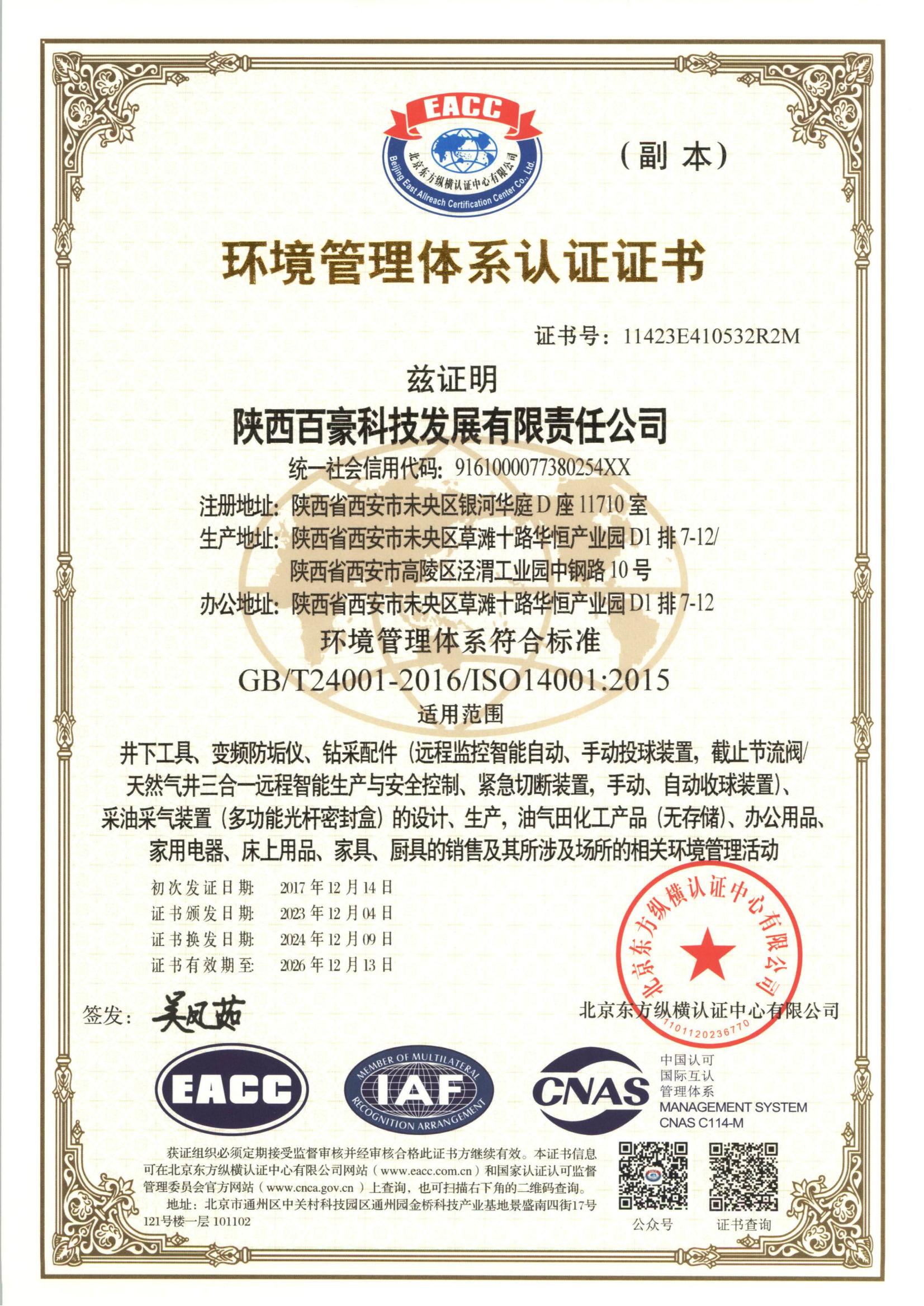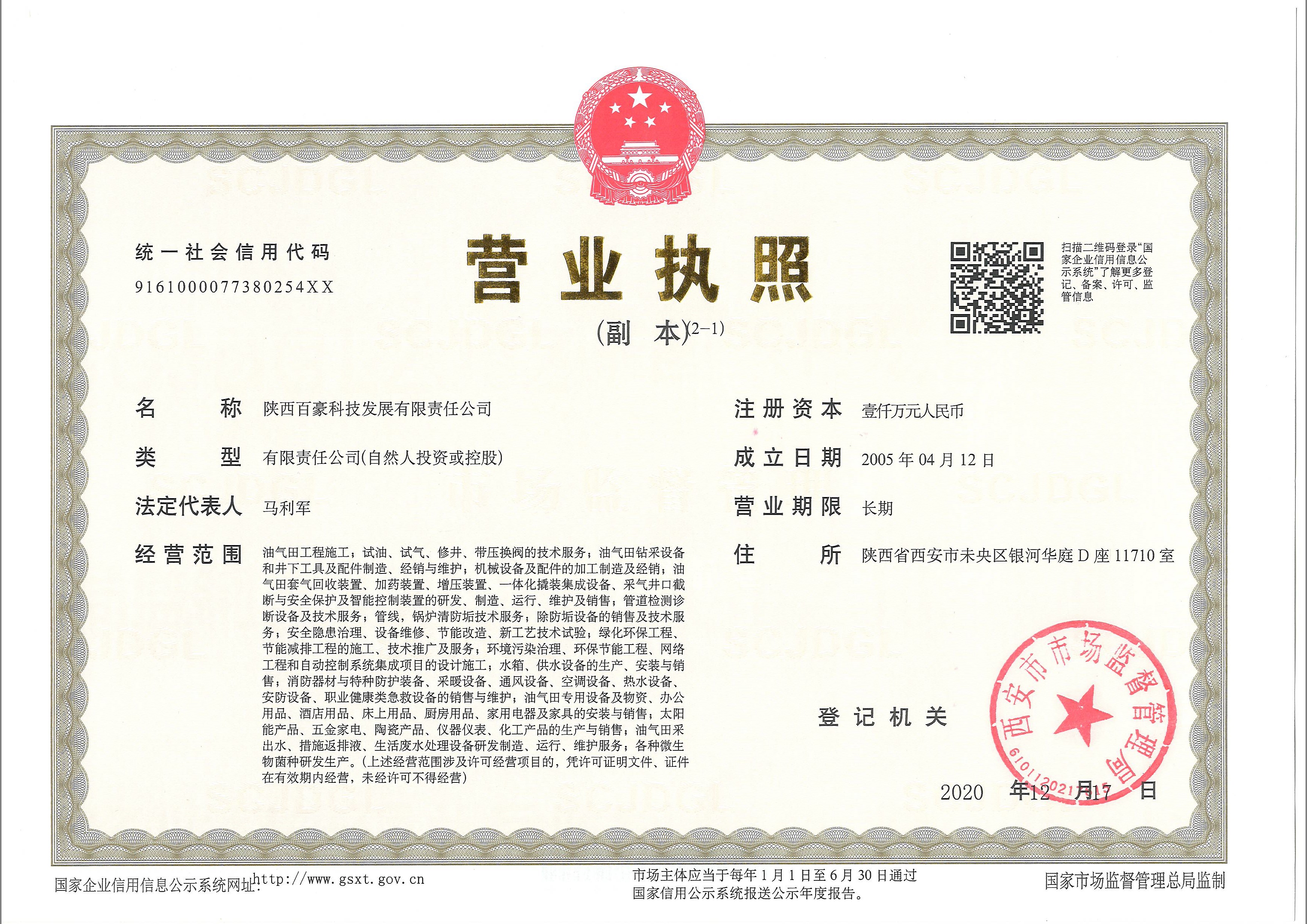 陕西百豪科技发展有限责任公司始建于2005年4月,公司注册地址为西安市未央路银河华庭D座1710室,注册资金1000万元。是一家专业从事油田钻采设备、工具、配件等特种设备制造以及油田工程技术服务,同时为油气田提供家具、生活电器及厨具等配有关服务的集设计、科研、开发、生产、销售于一体的综合性企业,公司产品广泛销往长庆、延长、青海、胜利、中原等油田,创造了良好的经济效益和社会效益。